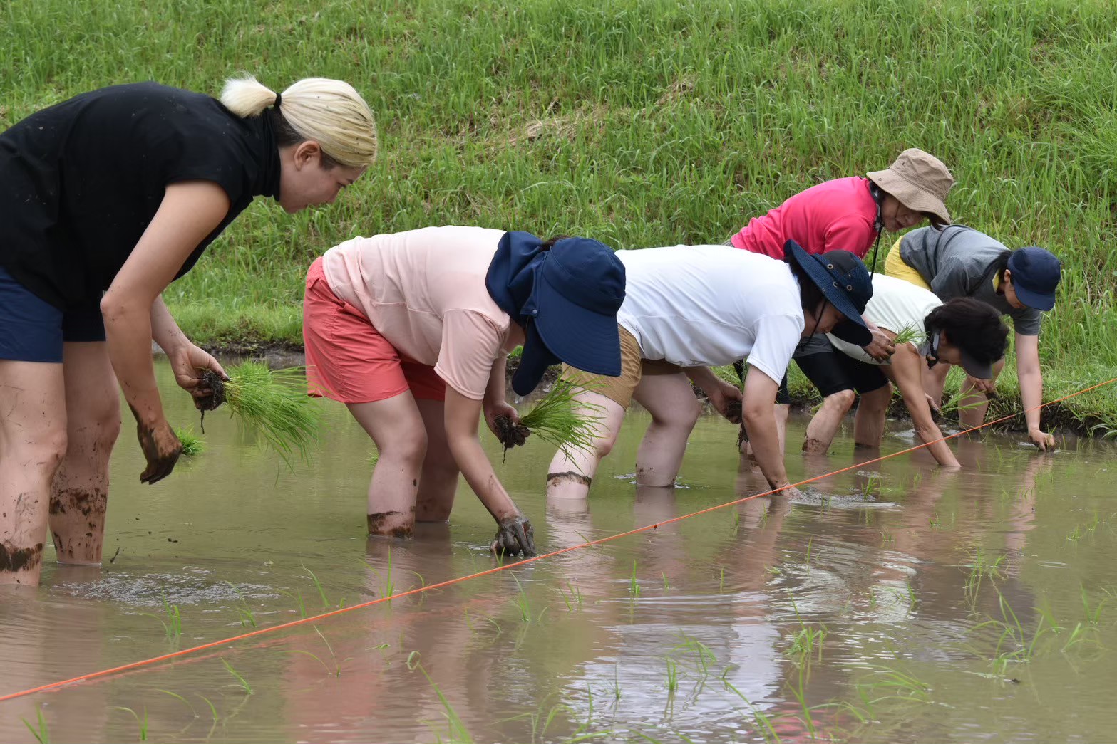 ※田植えは、言うなればスクワットの連続!正しいスクワットの仕方を教わっていざ田植え体験へ。