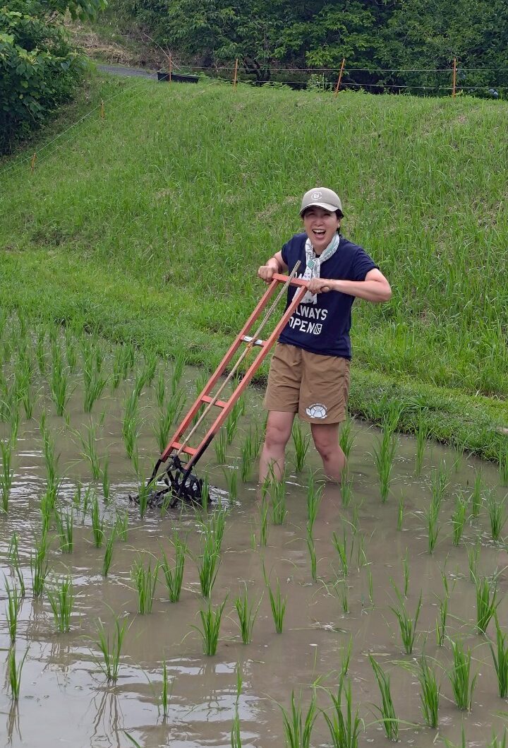 ※チェーン除草機と田車を使った草刈り体験!チェーンを引いて歩くのも、田車を押しながら歩くのも、なかなかの重労働。身体づくりもできてしまうお米づくり体験。